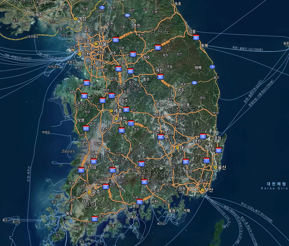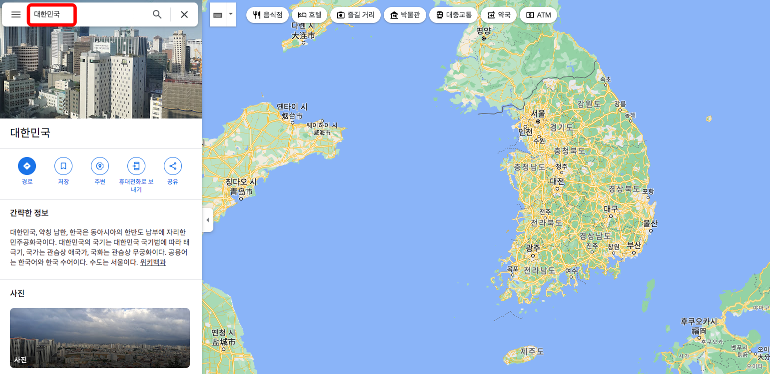 직관적인 우리나라 지도를 확인하시려면 구글 지도를 이용하시는 것을 추천드립니다. 구글지도 홈페이지에 방문하신 후 좌측 검색란에 ‘대한민국’을 입력하시고 엔터키를 칩니다.