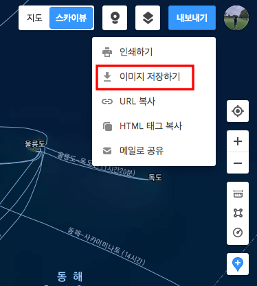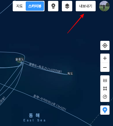 또한 원하시는 크기의 우리나라 지도를 찾았다면 파일로 저장하여 출력하실 일이 생길 수 있는데요. 이럴 때는 우측 상단 내보내기 메뉴를 선택합니다.