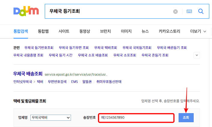 먼저 다음 포털 검색창에 '우체국 등기’를 검색합니다. 그러면 위 사진에 표시된 것처럼 송장번호를 입력하는 입력란이 나오는데요.