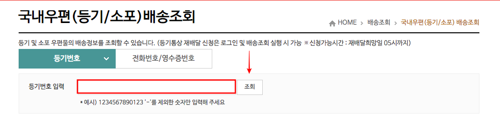 국내우편 등기 배송조회 페이지에서 등기번호를 입력합니다. 예시) 1234567890123 ‘-‘를 제외한 숫자만 입력해야 합니다.