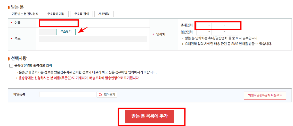 받는분 영역에는 받는 분의 이름과 주소, 휴대전화 번호를 입력한 후 하단의 받는 분 목록에 추가 버튼을 선택합니다.