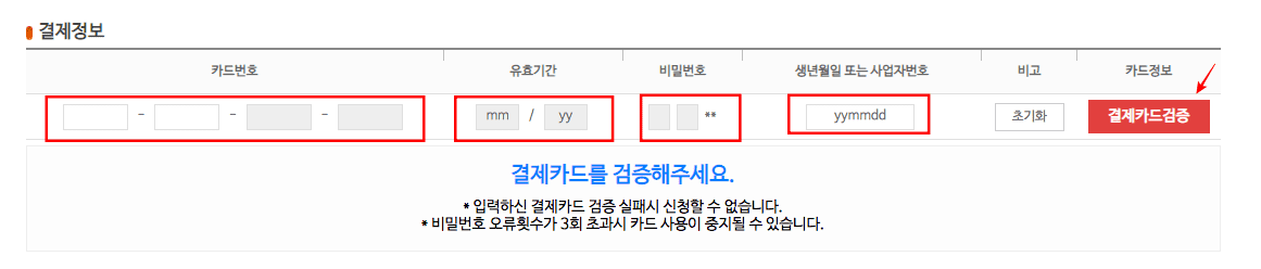 결제정보에 카드번호를 입력하시고 유효기간, 비밀번호, 생년월일을 입력한 후 우측의 결제카드검증 버튼을 클릭하여 검증을 완료합니다.