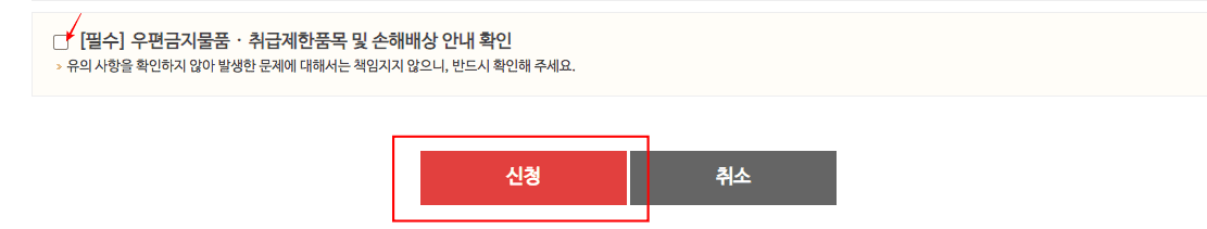 끝으로 [필수]우편금지물품, 취급제한품목 및 손해배상 안내 확인을 읽어보시고 체크한 후 하단의 신청 버튼을 클릭하면 우체국 택배 예약이 완료됩니다.