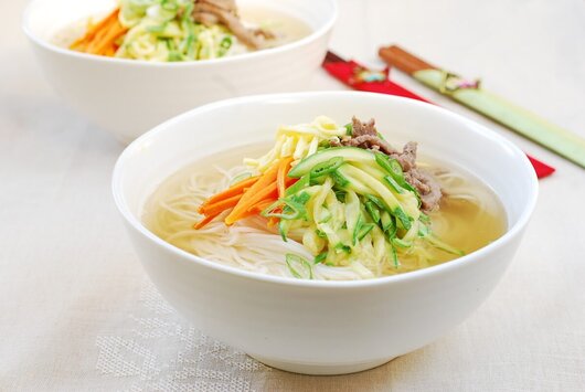 - 완성된 육수를 소면 그릇에 부어줍니다.