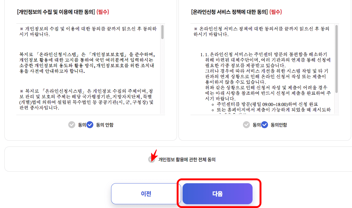 본인 인증이 완료되면 민원 서비스 메뉴에서 청소년증 (재발급/분실/분실철회) 메뉴에서 신청하기를 체크하시고 하단 버튼을 클릭합니다. 개인정보 활용에 관한 전체동의를 체크하시고 하단의 다음 버튼을 클릭합니다.