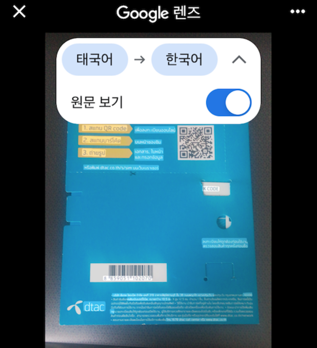번역을 원하는 태국어 이미지를 스마트폰으로 촬영합니다. 태국어로 되어 있는 글씨가 화면상에서 한국어로 표시되는 것을 확인할 수 있습니다. 구글 번역 카메라 기능은 실시간으로 텍스트를 빠르게 번역하기 때문에 간판이나 책, 안내글뿐만 아니라 TV에서 나오는 텍스트를 번역하는데도 유용하게 사용할 수 있습니다.