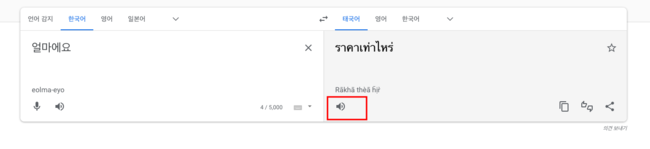 말하고 싶은 한국어 문장을 입력합니다. 여기에서는 여행객들이 가장 알고 싶어 하는 문장인 ‘얼마예요’를 입력해 보았습니다. 번역된 태국어가 표시되면 아래 사운드 버튼을 클릭하면 현지 발음을 확인할 수 있습니다.