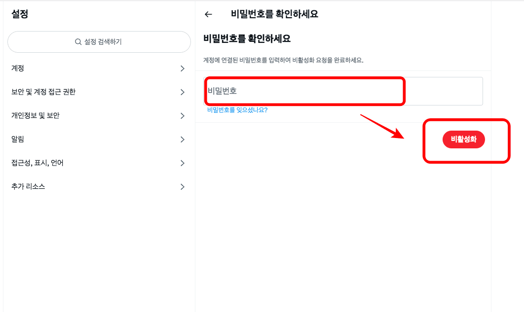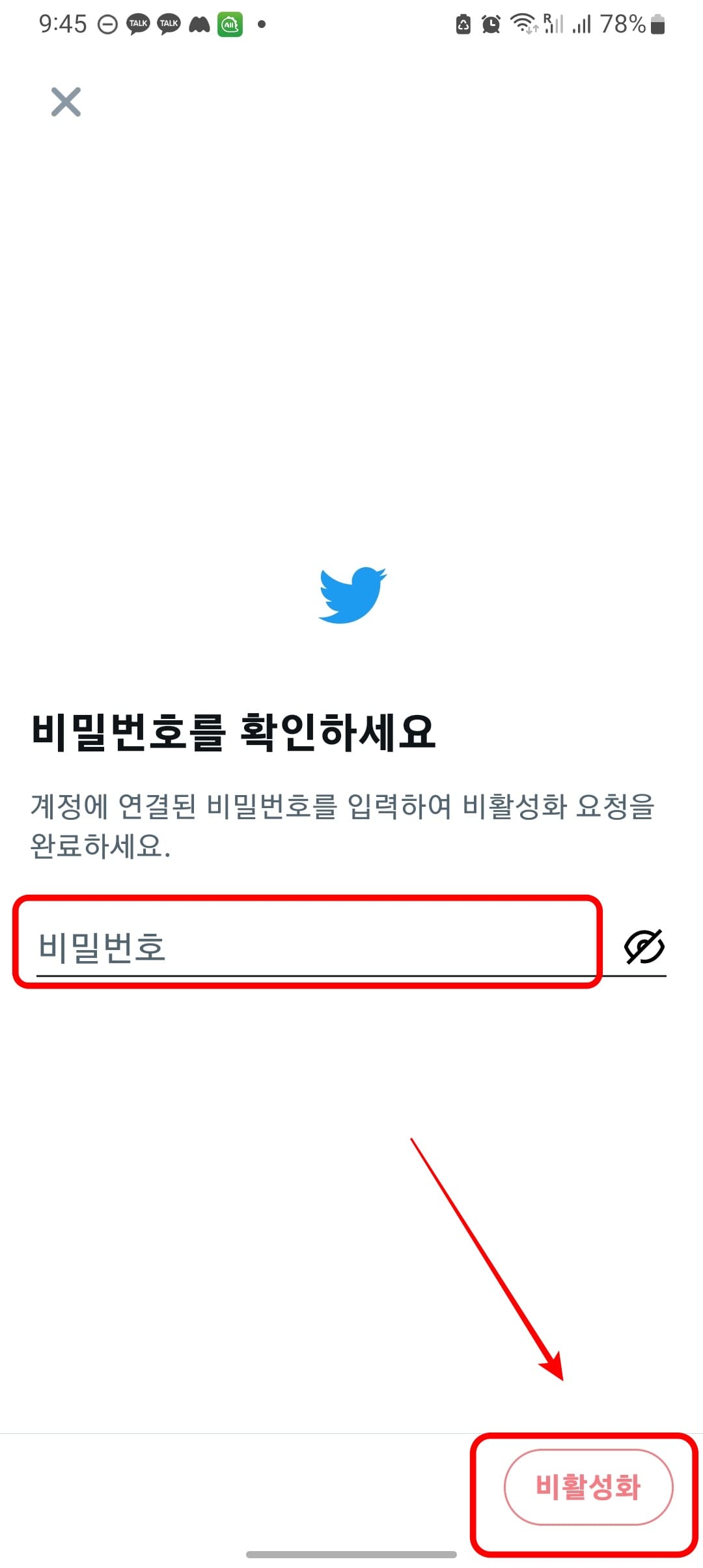 이후 비밀번호를 입력하신 후 우측 하단의 비활성화 버튼을 클릭하면 트위터 탈퇴가 됩니다.