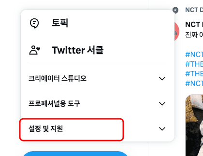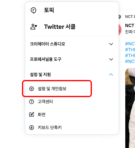 트위터 로그인에 성공하셨다면 위와 같은 홈 화면을 보실 수 있습니다. 좌측 메뉴 하단의 더 보기 메뉴를 클릭합니다. 더 보기 메뉴를 클릭하면 설정 및 지원 > 설정 및 개인정보 메뉴 순서로 클릭합니다.