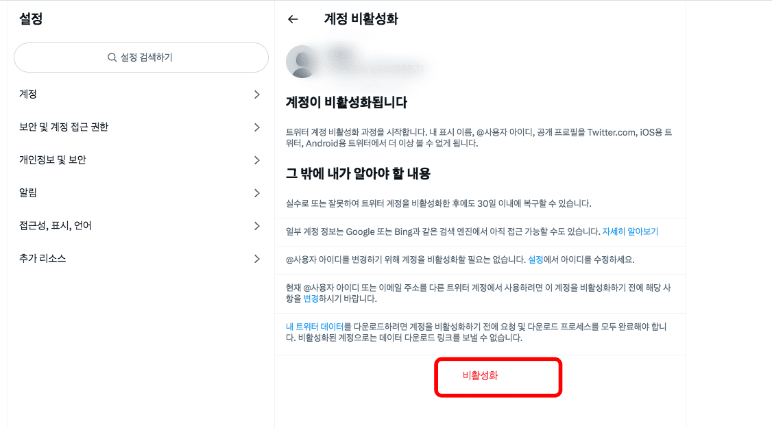 트위터 계정을 비활성화 시키면 계정이 삭제되어 플랫폼에서 자신이 업로드한 트윗이나 프로필은 모두 삭제가 됩니다. 하지만 30일의 유예기간이 있어 30일 안에는 다시 계정을 활성화시킬 수 있으며 30일 이후 사용자의 데이터가 완전히 삭제됨을 기억하시기 바랍니다.