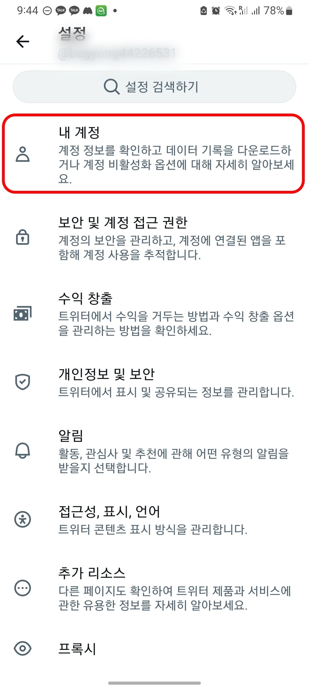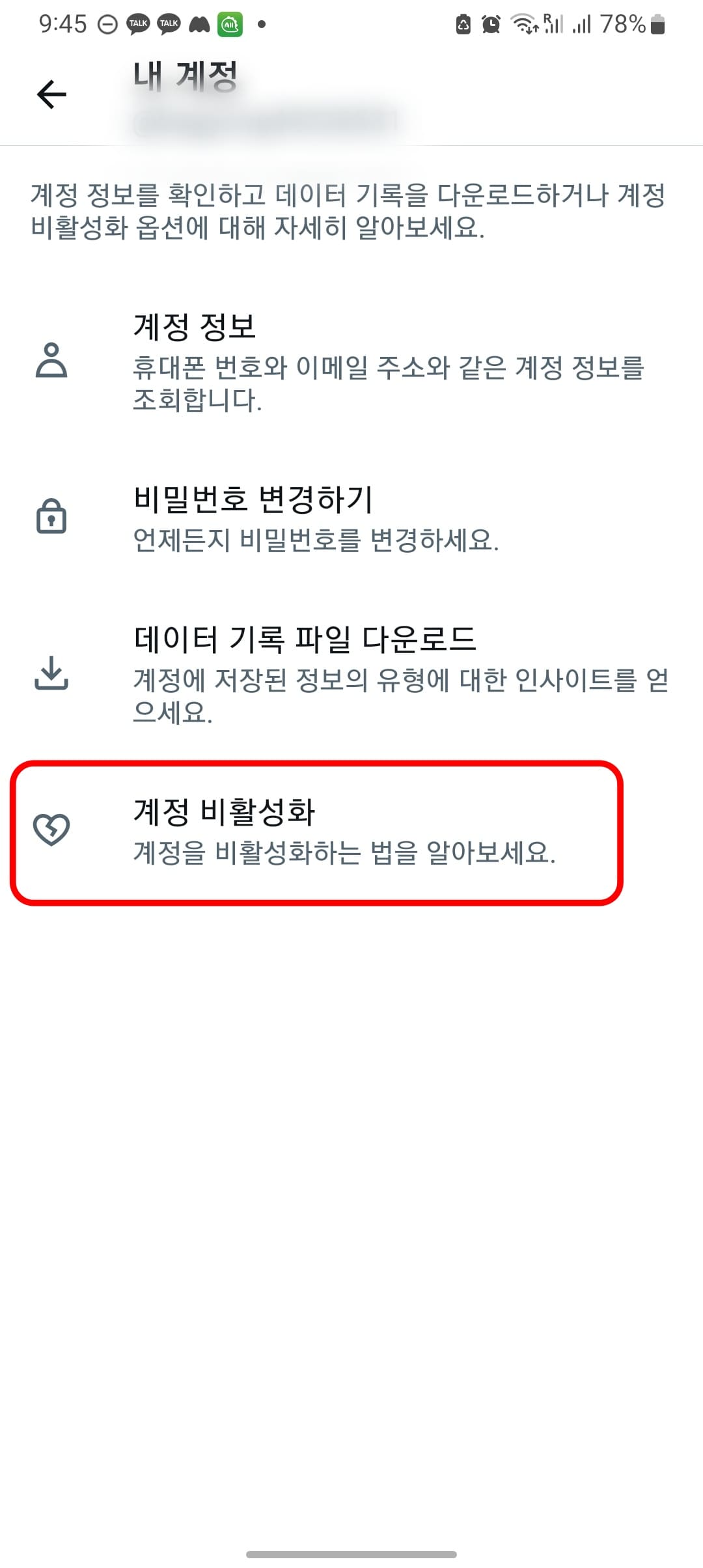 설정 > 내 계정 메뉴를 터치합니다. 이후 하단의 계정 비활성화를 터치합니다.