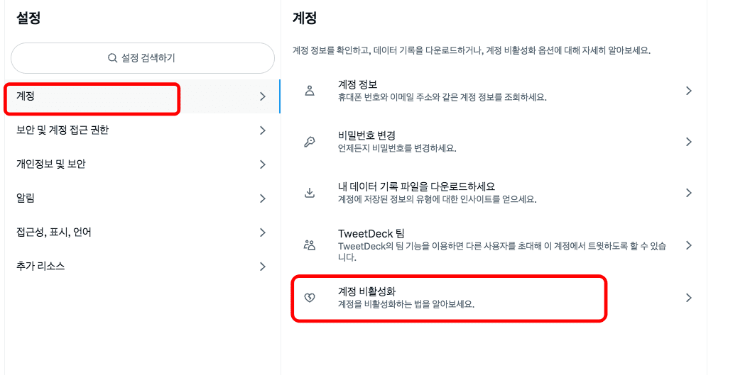 설정 화면이 표시되면 계정 > 계정 비활성화를 선택합니다. 계정 비활성화 메뉴 하단에서 비활성화 버튼을 클릭합니다.