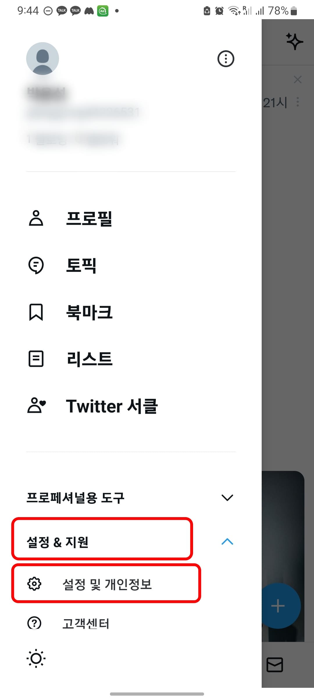 모바일에서도 트위터 계정을 탈퇴할 수 있습니다. 먼저 트위터 어플을 실행합니다. 이후 좌측 상단의 프로필 아이콘을 터치합니다. 프로필 메뉴가 표시되면 하단 프로페셜널용 도구 > 설정 & 지원 > 설정 및 개인정보 메뉴를 터치합니다.