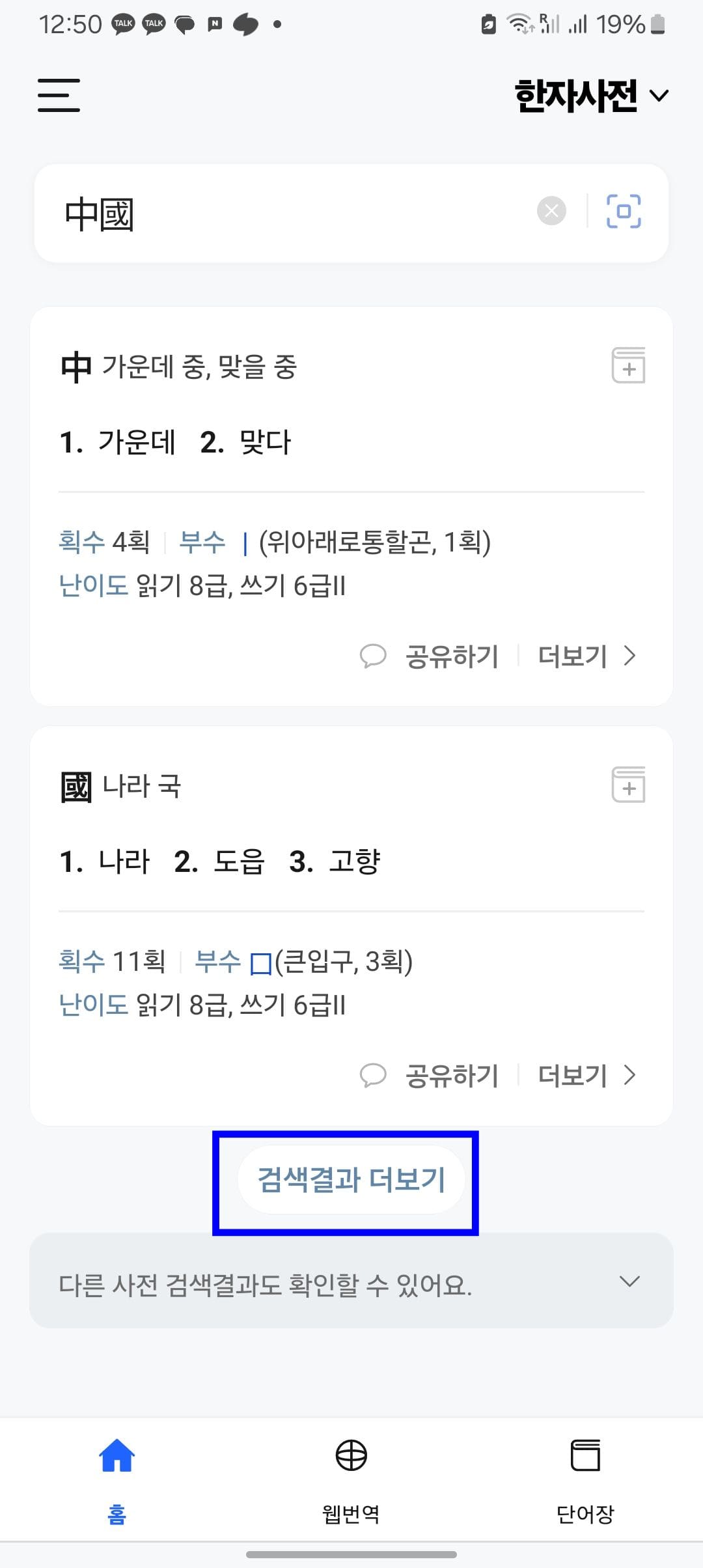 검색결과를 확인해보니 가운데 중과 나라 국이 만나 ‘중국’이 된 것을 확인할 수 있습니다. 하단의 검색결과 더 보기를 선택하면 해당 한자가 사용된 더 많은 단어를 살펴볼 수 있습니다.