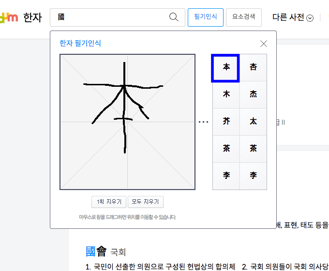 이번에는 한가지 한자가 아닌 두 가지 한자를 써서 찾아보도록 하겠습니다. 상단 검색창 우측의 필기인식 메뉴를 클릭합니다. 이번에는 ‘본’이라는 한자를 써보았습니다. 마찬가지로 우측에는 가장 유사한 한자를 선택하면 입력창에 자동으로 입력됩니다. 이후 오른쪽 돋보기 아이콘을 클릭합니다.