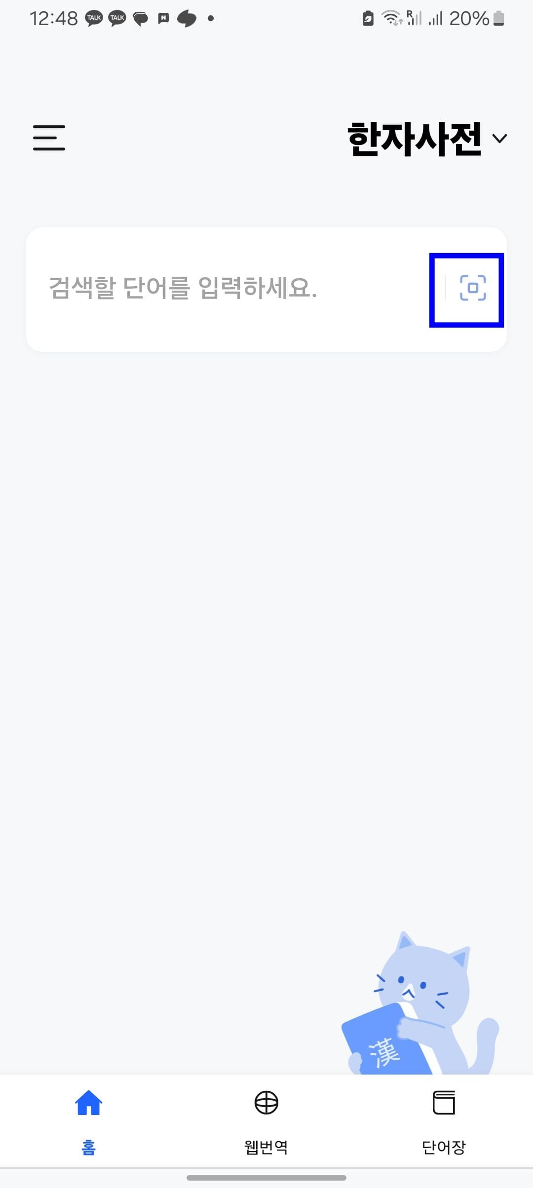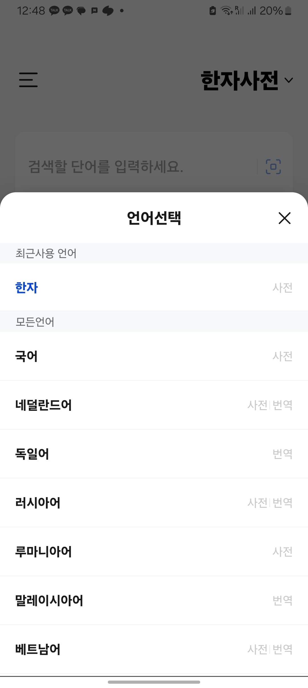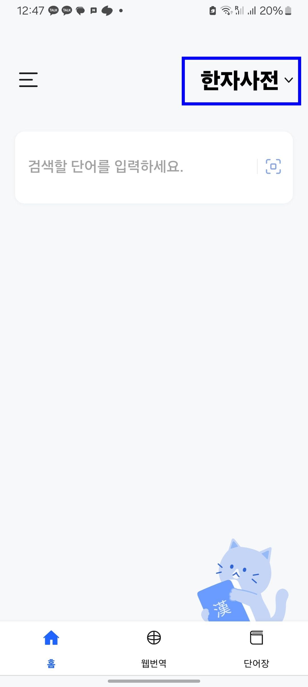 다음사전앱을 실행하면 위와 같은 메인 화면을 볼 수 있습니다. 표시된 한자사전 영역이 다른 언어로 되어 있다면 터치하여 사전을 한자사전으로 변경해 줍니다.