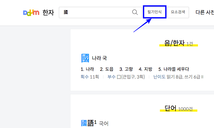 PC에서 한자를 써서 찾으려면 ‘다음 한자 사전’ 으로 이동해야 합니다. 아래 링크를 통해 방문하시기 바랍니다.