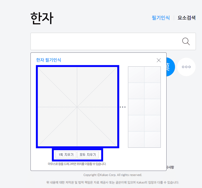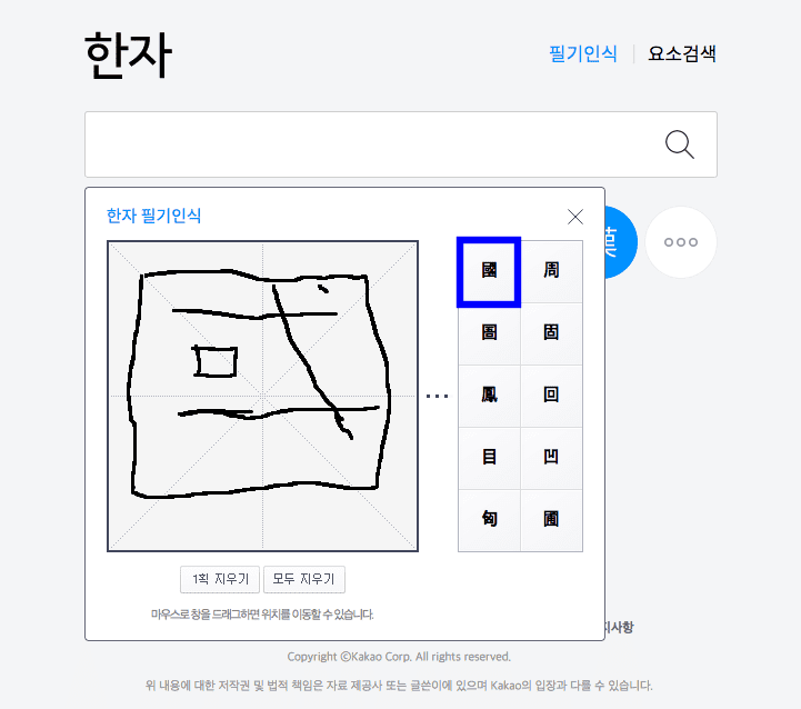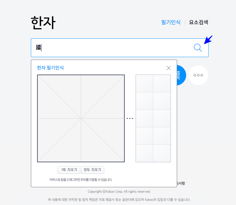 다음 한자 사전에 도착하면 위와 같은 검색창을 보게 됩니다. 우측 상단의 필기인식 메뉴를 클릭합니다. 검색창 하단에 한자 필기 인식 창이 생기면 표시된 사각형 영역에 한자를 마우스로 쓰면 됩니다. 만약 틀리는 경우에는 하단의 1획 지우기 또는 모두 지우기를 클릭해서 초기화할 수 있습니다.