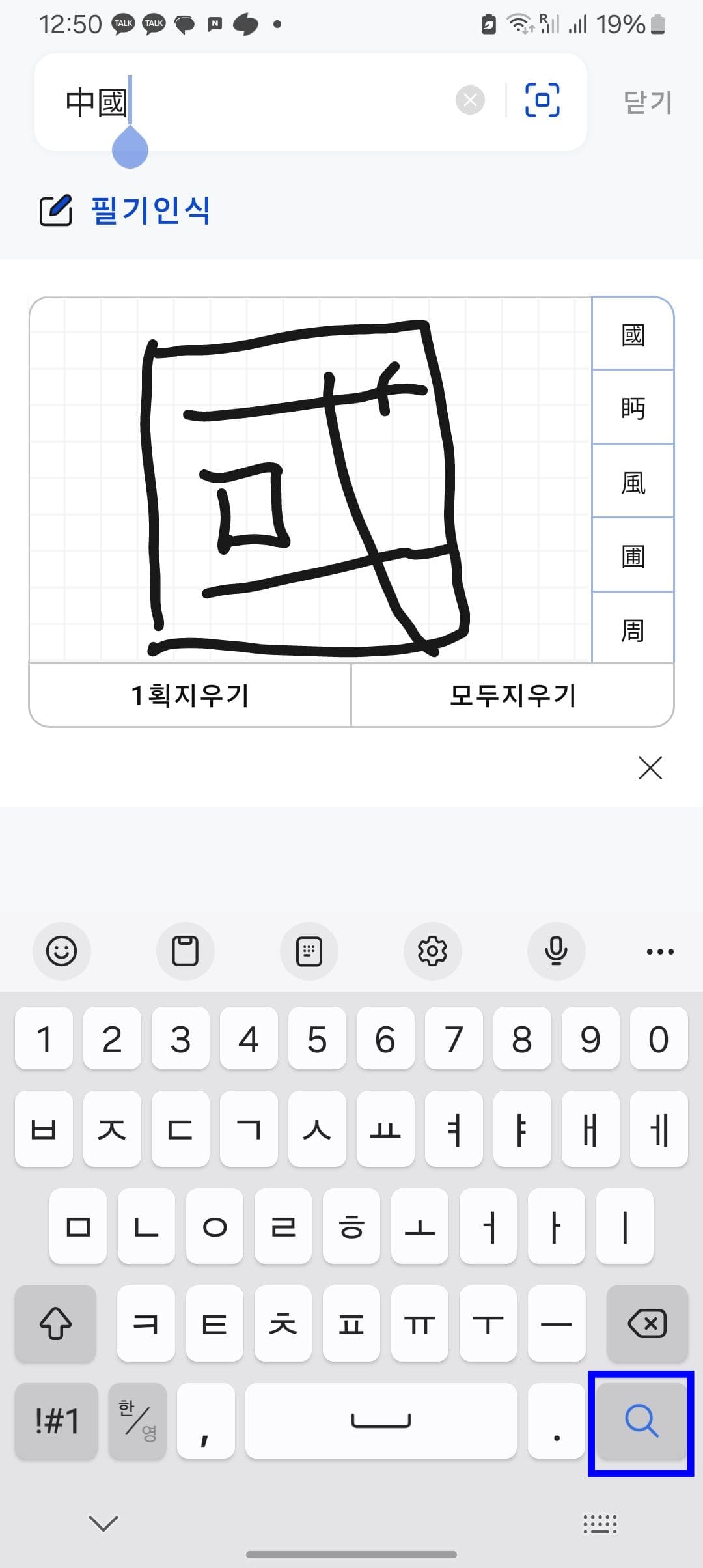 기억나는 한자가 많지 않아서 ‘국’ 자를 써보았습니다. 우측에서 가장 유사한 한자를 선택하면 입력창에 자동으로 한자가 입력됩니다. 오후 오른쪽 돋보기 아이콘을 클릭합니다.