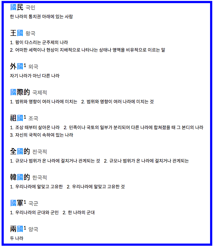 해당 한자는 [나라 국]으로 나라, 도읍, 고향, 지방, 나라를 세우다는 뜻을 가지고 있습니다. 획수는 11획, 부수는 큰 입구라는 정보도 표시됩니다. 하단에서는 해당 한자가 사용된 다양한 단어들을 살펴볼 수 있습니다. 국어, 국회, 국제, 본국, 왕국, 국민, 조국 등 알아두면 유용한 한자들이 많이 있습니다.