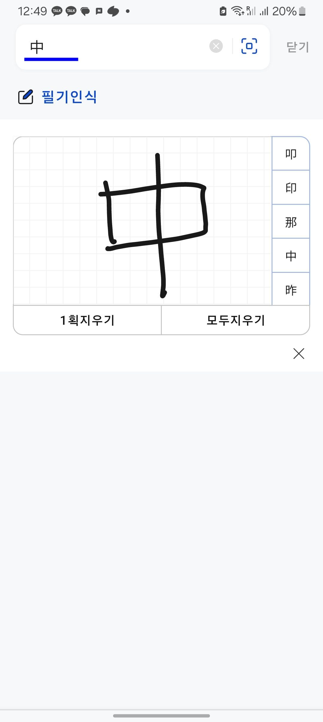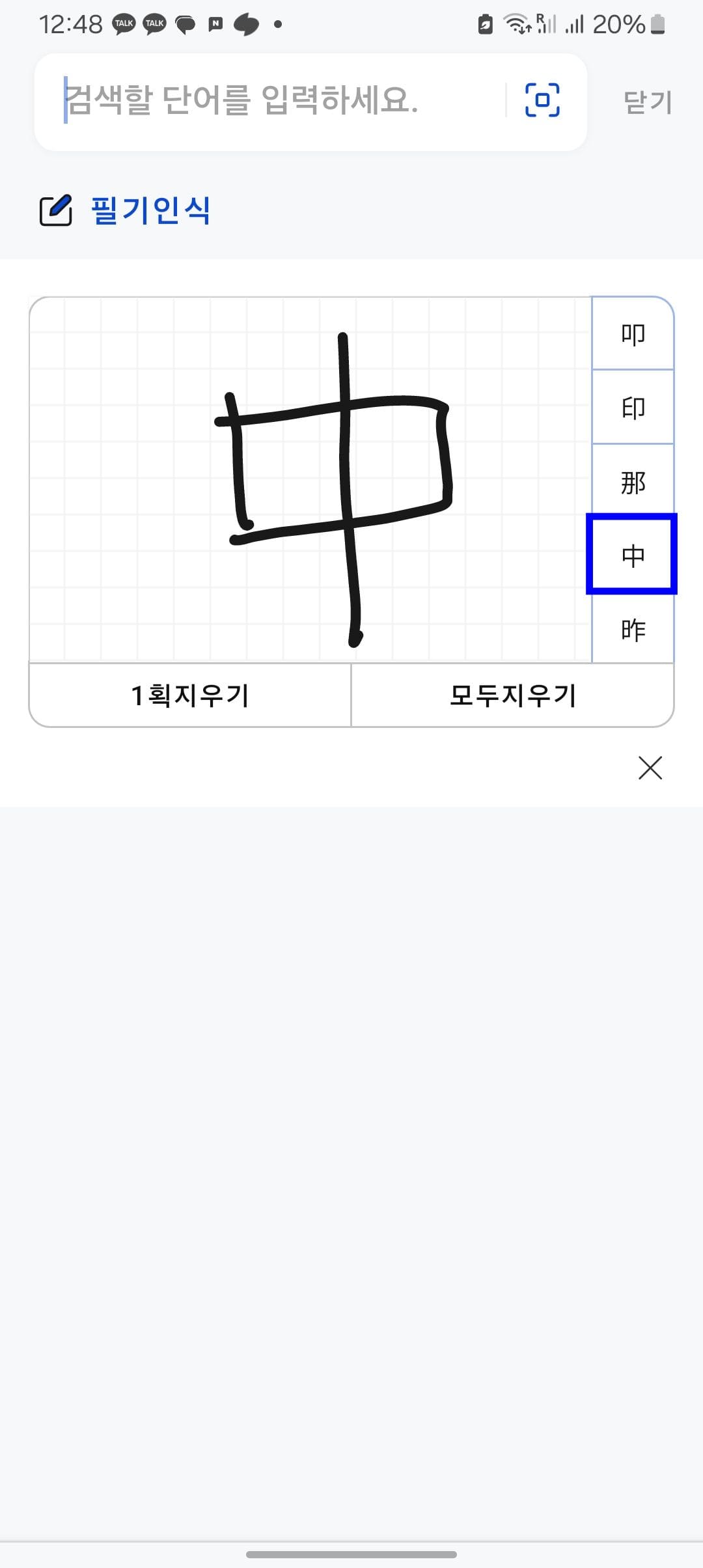 검색창 오른쪽의 아이콘을 터치하면 필기인식 메뉴로 전환됩니다. 필기인식 페이지 직사각형 영역에 손가락으로 한자를 쓰면 됩니다. 만약 틀리거나 잘못 썼을 경우에는 하단의 1획 지우기, 모두 지우기 버튼을 클릭해서 지울 수 있습니다.
