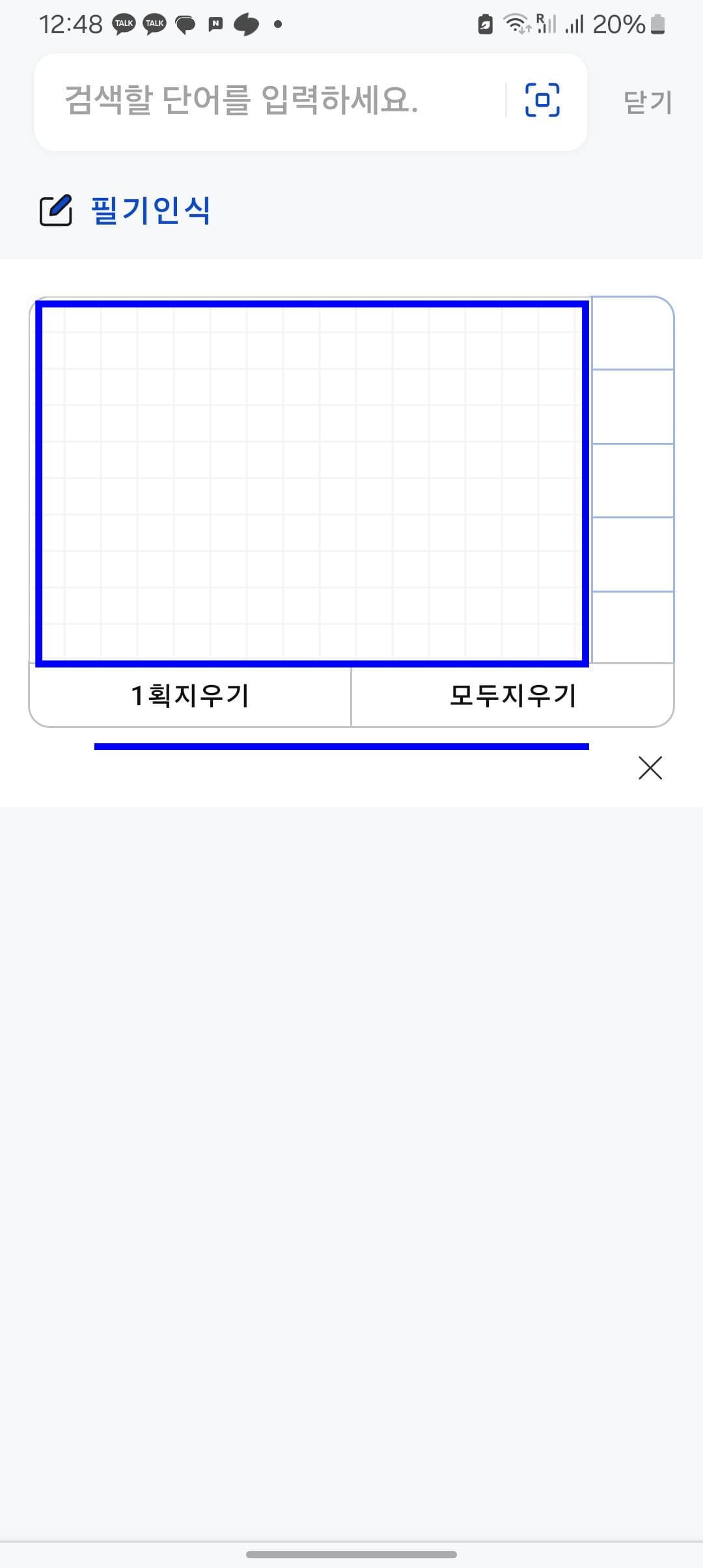 검색창 오른쪽의 아이콘을 터치하면 필기인식 메뉴로 전환됩니다. 필기인식 페이지 직사각형 영역에 손가락으로 한자를 쓰면 됩니다. 만약 틀리거나 잘못 썼을 경우에는 하단의 1획 지우기, 모두 지우기 버튼을 클릭해서 지울 수 있습니다.