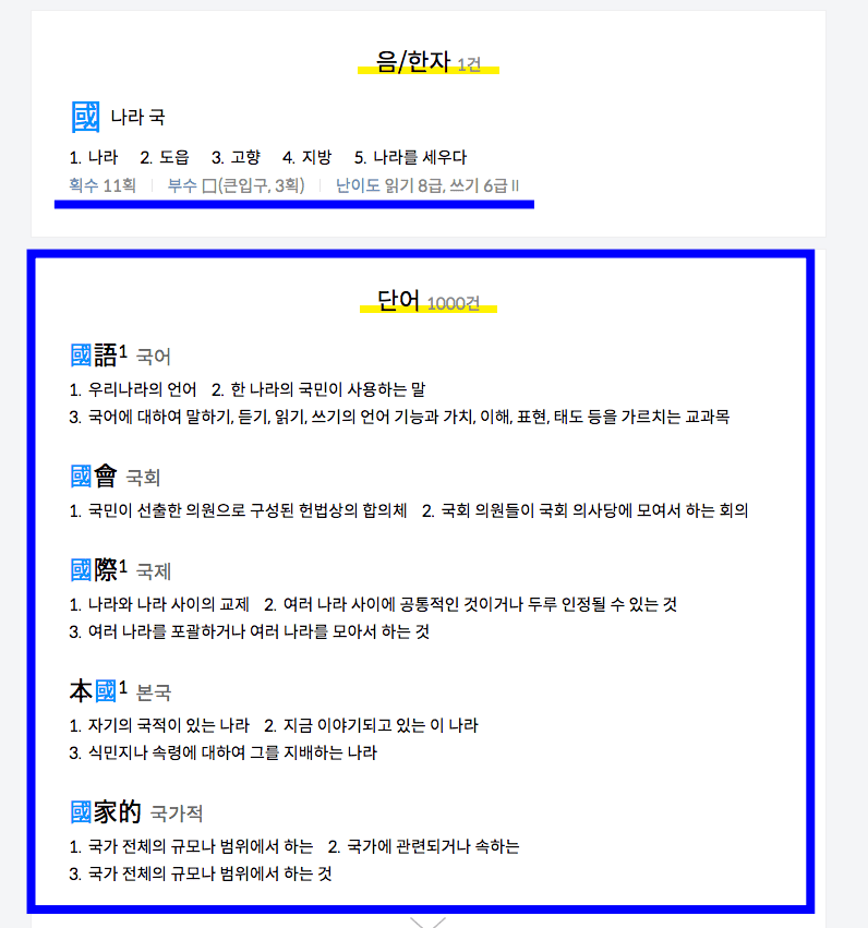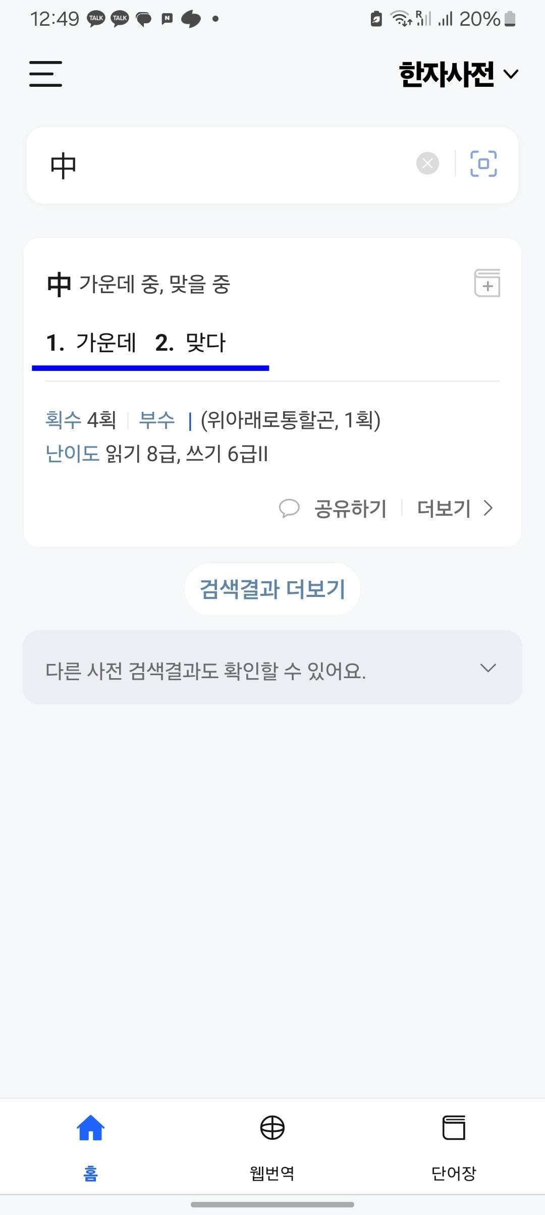 검색결과를 확인해보니 가운데 중과 나라 국이 만나 ‘중국’이 된 것을 확인할 수 있습니다. 하단의 검색결과 더 보기를 선택하면 해당 한자가 사용된 더 많은 단어를 살펴볼 수 있습니다.