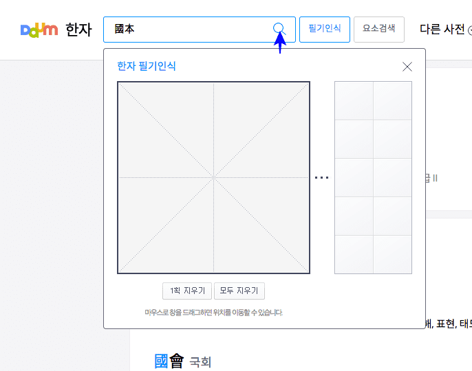 기억나는 한자가 많지 않아서 ‘국’ 자를 써보았습니다. 우측에서 가장 유사한 한자를 선택하면 입력창에 자동으로 한자가 입력됩니다. 오후 오른쪽 돋보기 아이콘을 클릭합니다.