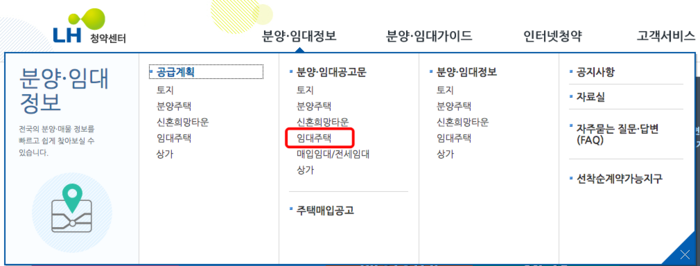 분양 임대 공고문 하위 메뉴에서 임대주택을 선택합니다. 공고문에는 분양주택이나 신혼 희망타운, 매입임대, 전세임대 등의 공고도 확인할 수 있으니 참고하시기 바랍니다.