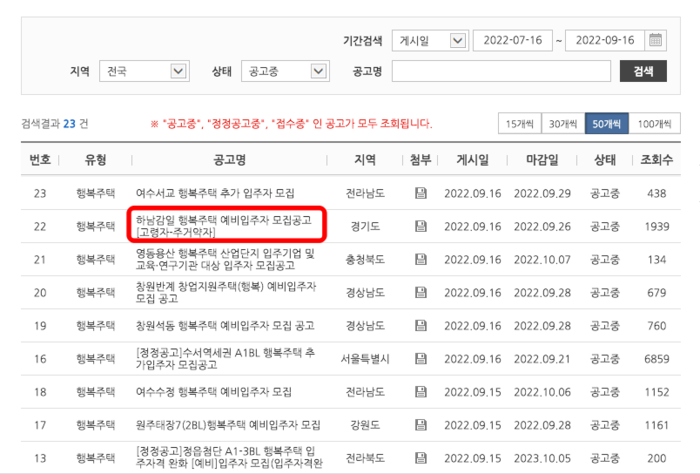 행복주택 공고문은 공고명, 지역, 게시일, 마감일 등으로 표시되며 공고명을 클릭하면 자세한 정보를 조회할 수 있습니다. 최대한 많은 행복주택을 비교해 보시고 천천히 결정하는 것이 좋습니다.