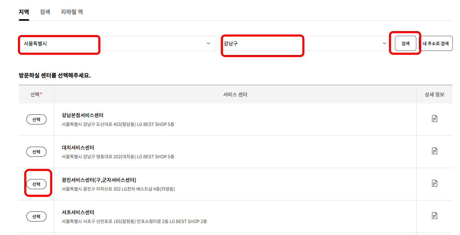 거주 지역을 입력하시고 검색 버튼을 클릭하면 하단에 거주지 인근에 위치한 서비스센터를 확인할 수 있습니다. 가장 가까운 서비스 센터를 찾아 선택을 클릭합니다. 희망 방문 일시를 날짜와 시간으로 선택합니다.