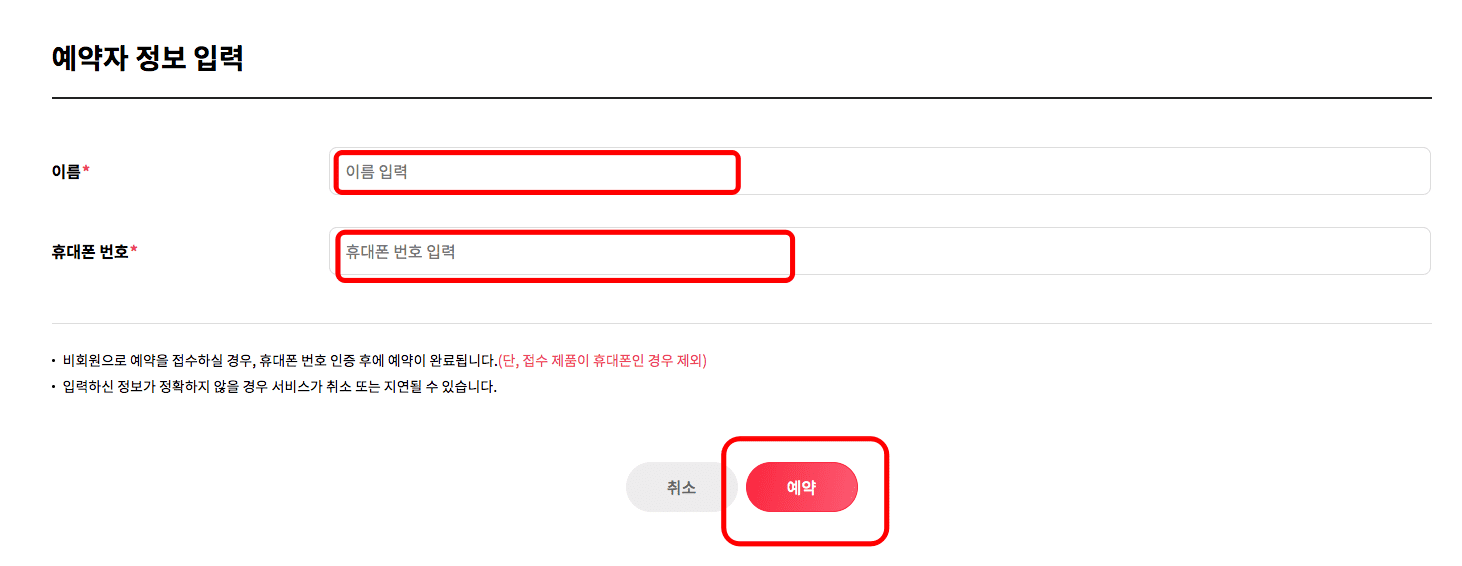 제품의 구매정보와 고장증상을 선택하시고 예약자 정보에 이름과 휴대폰 번호를 입력하신 후 하단의 예약 버튼을 클릭하면 접수가 완료됩니다.