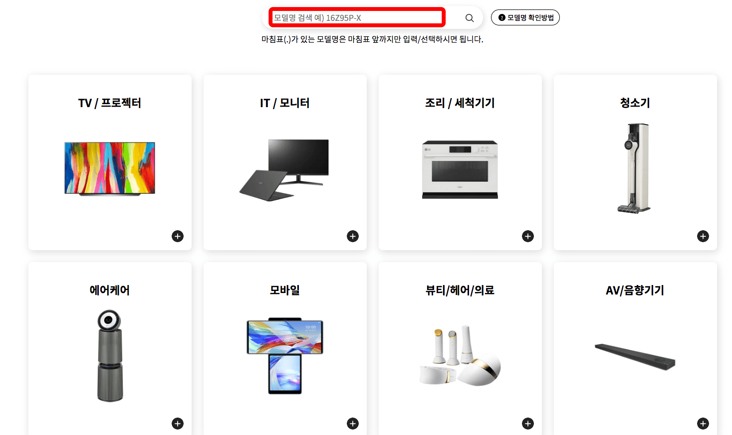 모델명 검색란에 모델명을 입력하시거나 아래에서 제품을 선택합니다. 제품을 선택했다면 다음 페이지에서 세부 모델을 선택합니다.