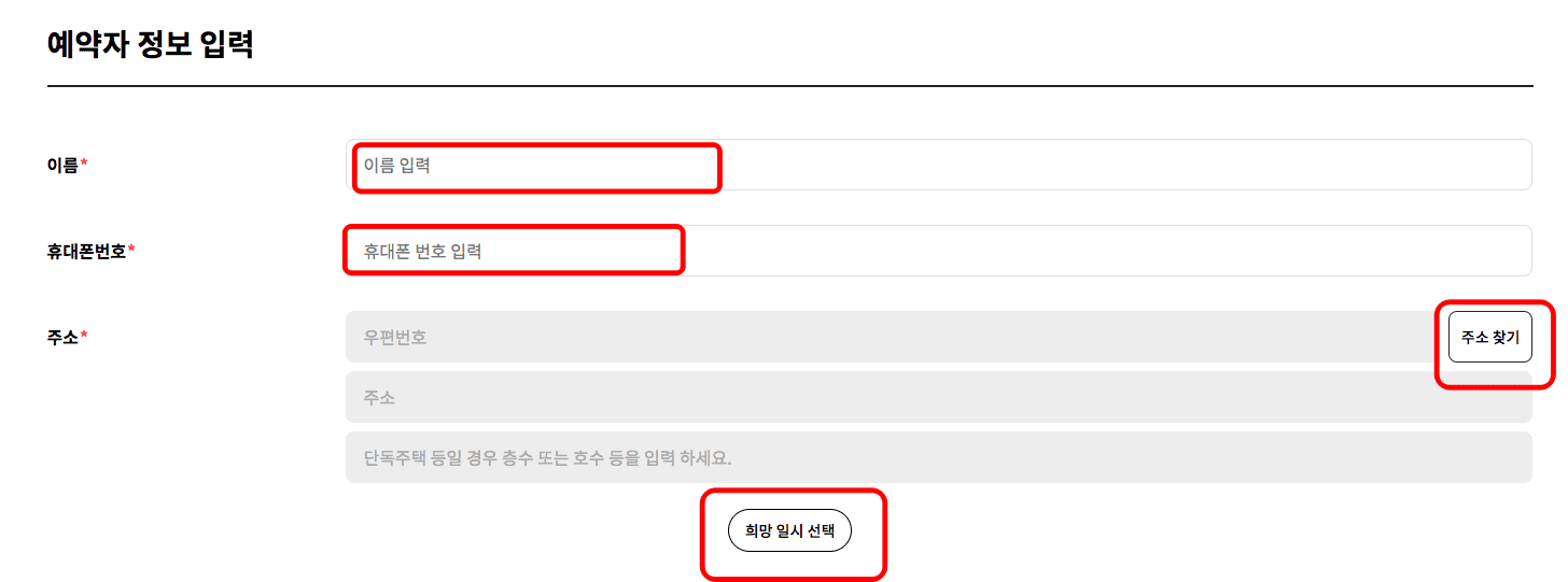 하단 추가정보에서 설치형태를 선택합니다. 예약자 정보 입력 메뉴가 표시됨녀 이름과 휴대폰 번호, 주소 찾기 버튼을 클릭하여 상세 주소를 입력하시고 하단에서 희망 일시를 선택하면 AS 접수가 완료됩니다.