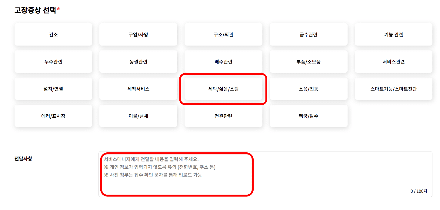약관동의 화면에 동의합니다 체크를 하시고 하단에서 제품 구매정보를 구입시기와 렌털여부에 각각 표시합니다. 이후 고장 증상을 선택하시고 하단 전달사항에 100자 이하의 고장에 대한 설명을 간략하게 적습니다.