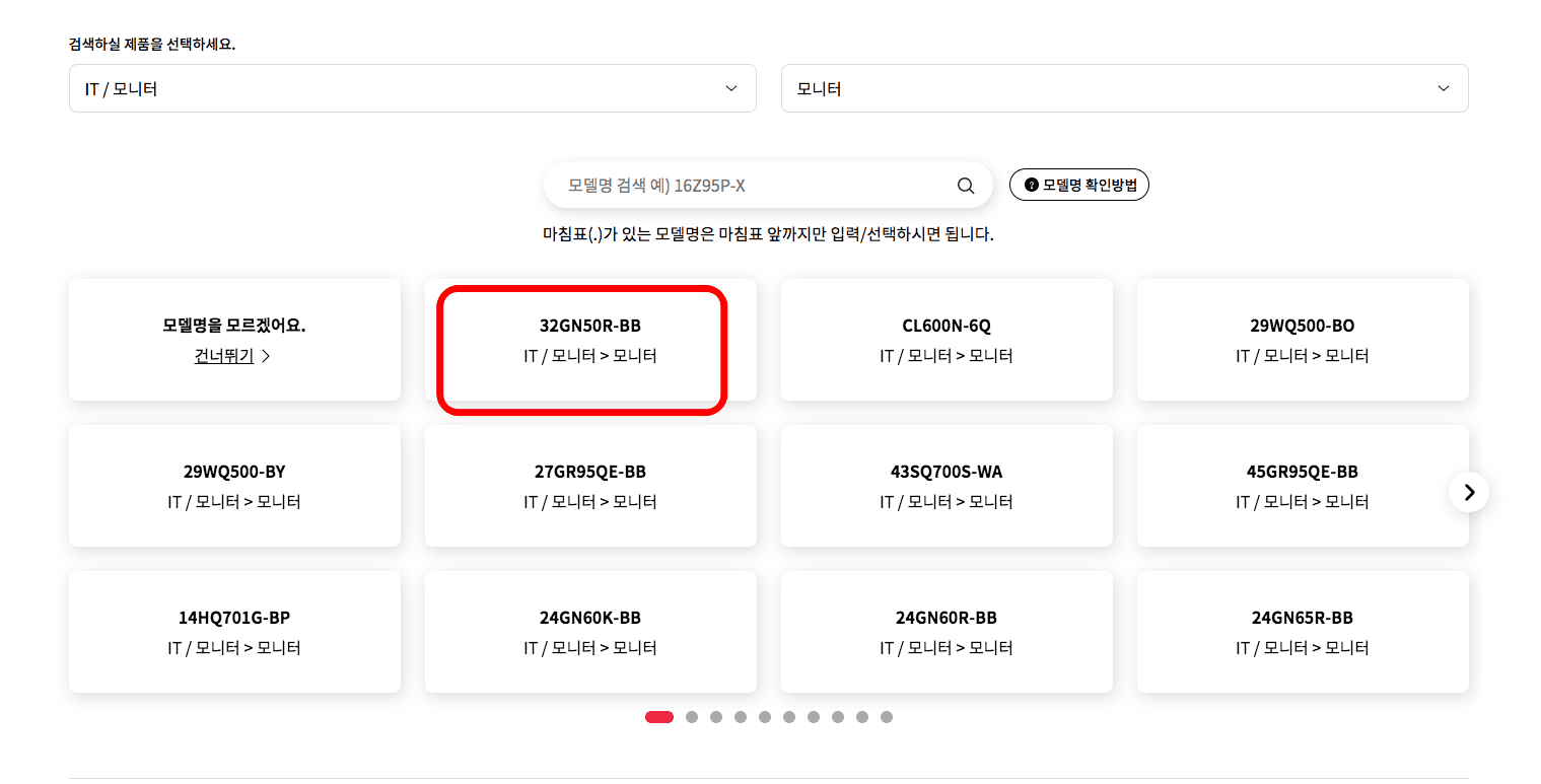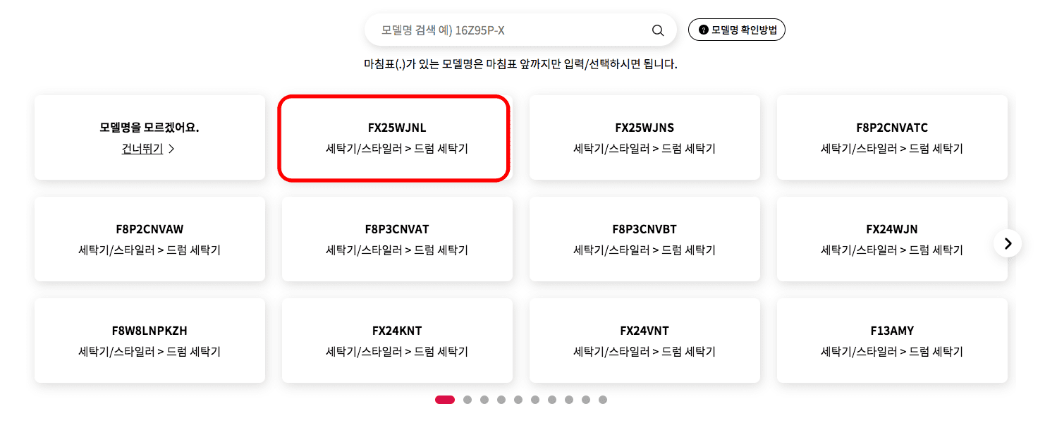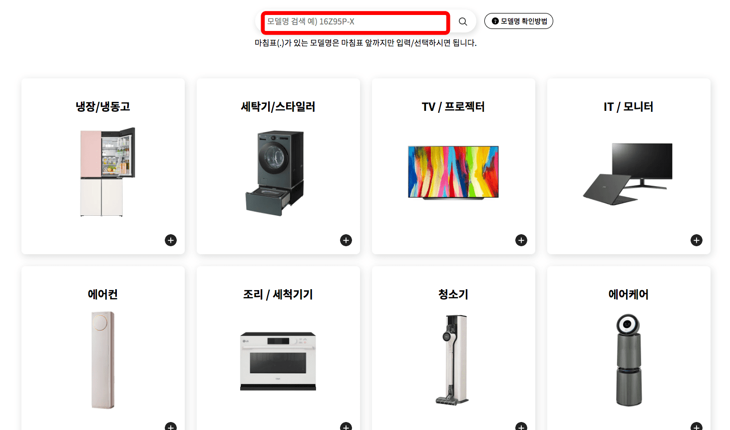 모델명 검색란에 모델명을 입력하시거나 아래에서 제품을 선택합니다. 제품을 선택했다면 다음 페이지에서 세부 모델을 선택합니다.