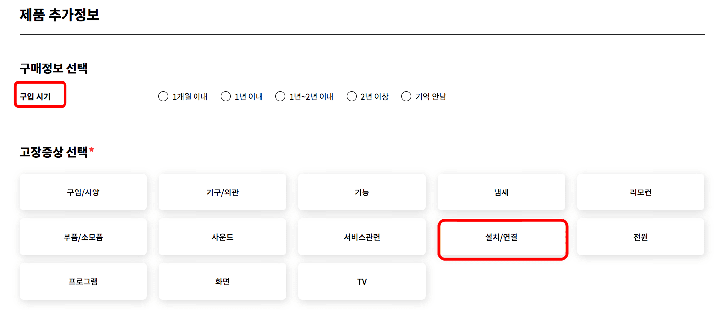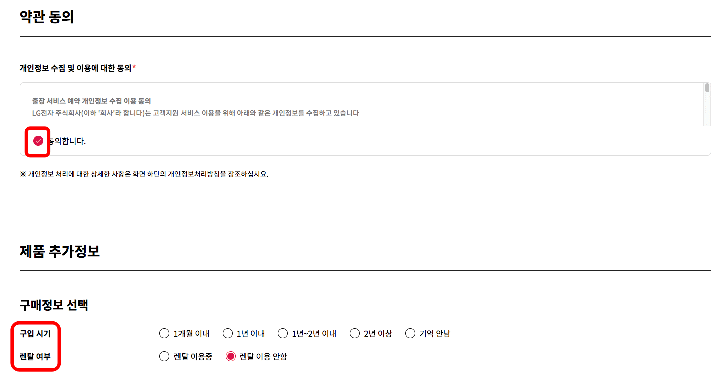 약관동의 화면에 동의합니다 체크를 하시고 하단에서 제품 구매정보를 구입시기와 렌털여부에 각각 표시합니다. 이후 고장 증상을 선택하시고 하단 전달사항에 100자 이하의 고장에 대한 설명을 간략하게 적습니다.