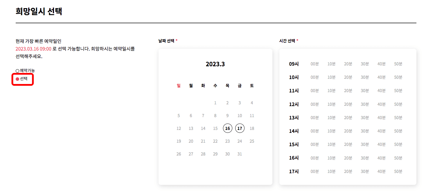 거주 지역을 입력하시고 검색 버튼을 클릭하면 하단에 거주지 인근에 위치한 서비스센터를 확인할 수 있습니다. 가장 가까운 서비스 센터를 찾아 선택을 클릭합니다. 희망 방문 일시를 날짜와 시간으로 선택합니다.