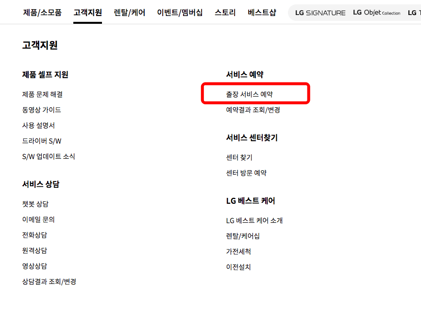 메인화면으로 이동하시면 위의 사진처럼 상단 두번째 메뉴인 고객지원을 선택합니다. 이후 세부 메뉴 서비스 예약 > 출장 서비스 예약을 클릭합니다.
