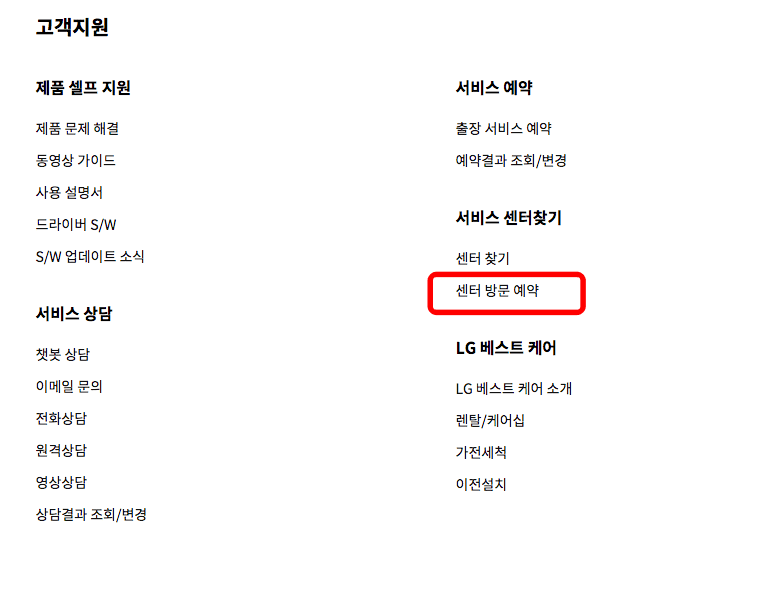 세탁기나 냉장고의 경우에는 출장 서비스를 이용할 수밖에 없습니다. 하지만 출장비가 부과되기 때문에 TV나 이동이 가능한 전자제품의 경우는 방문 AS로 접수하시면 출장비를 아낄 수 있습니다. 먼저 LG전자 서비스센터 홈페이지 고객지원 메뉴에서 서비스 센터 찾기 > 센터 방문 예약을 클릭합니다.