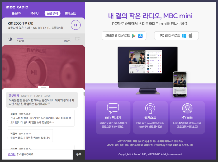 미니 엠비씨 홈페이지로 이동하시면 아래와 같은 화면을 보실 수 있습니다. 이곳이 바로 여러분들이 원하시는 라디오를 실시간으로 서비스해주는 공간인데요.