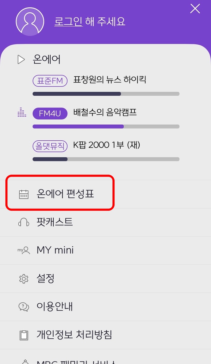 세부 메뉴로 이동하면 현재 진행 중인 온에어 채널들이 표시되고 아래에서 온에어 편성표와 팟캐스트 My mini 등의 메뉴를 확인할 수 있습니다.