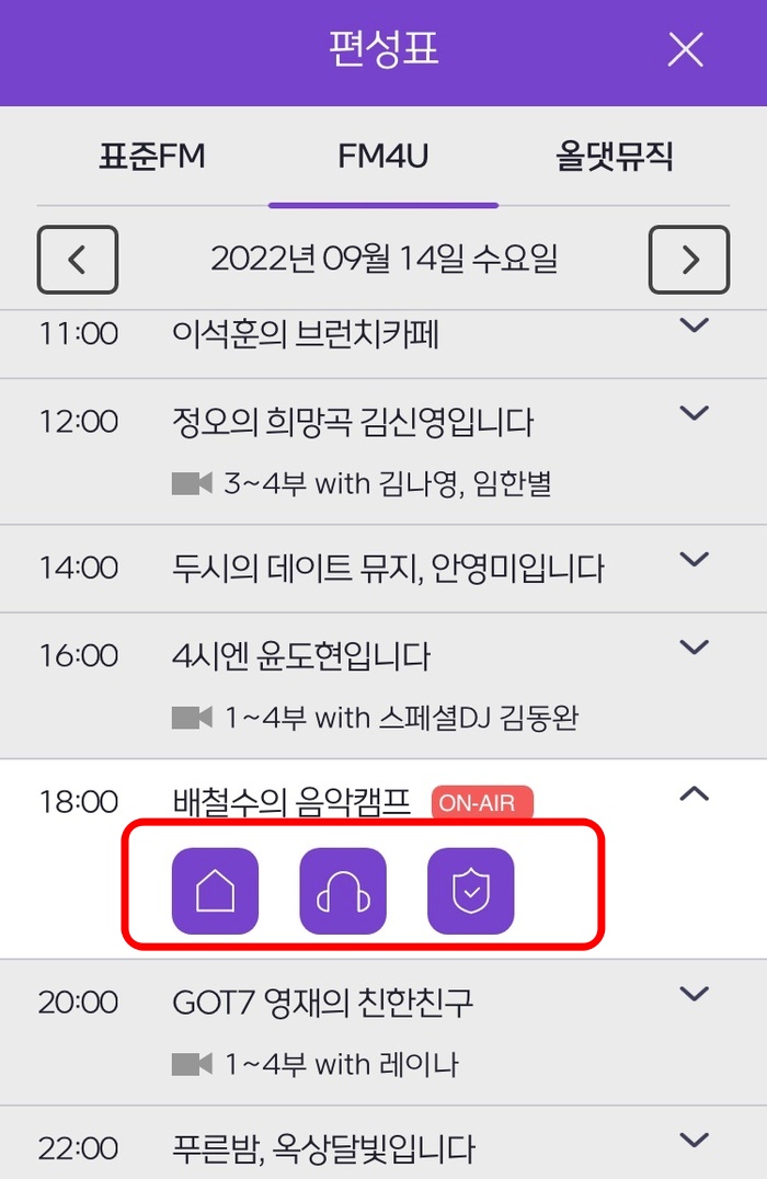온에어 편성표를 확인해보면 각 시간마다 채널이 분류되고 청취나 갈무리 버튼을 터치하여 즐겨찾기처럼 추가하거나 관리할 수 있습니다. 이러한 기능을 사용해 보면 평소 자신이 즐겨 듣는 채널들을 표시해주는 맛이 있기도 합니다.