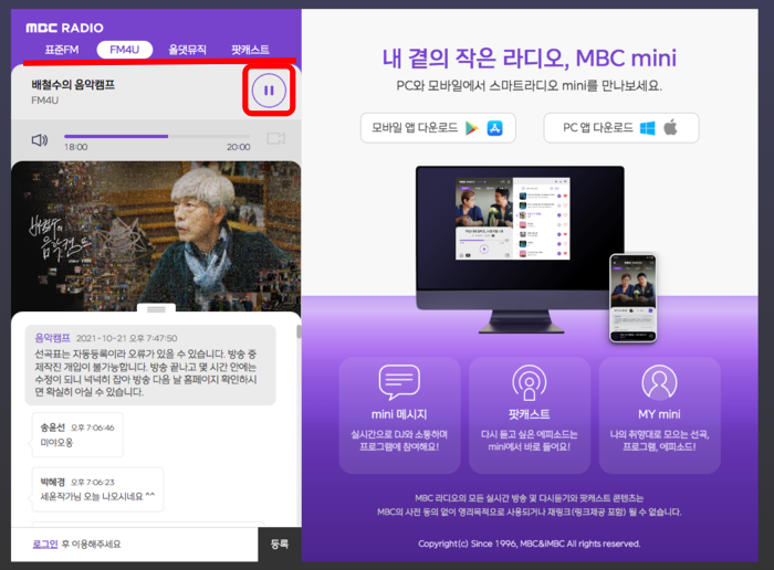 로그인 없이도 언제 어디서든 바로 청취가 가능하기 때문에 인터넷이 연결된 어떠한 기기로 접속하더라도 편리하게 청취할 수 있습니다. 단순하게 우측에서 재생 버튼을 클릭하면 실시간 라디오가 재생됩니다.