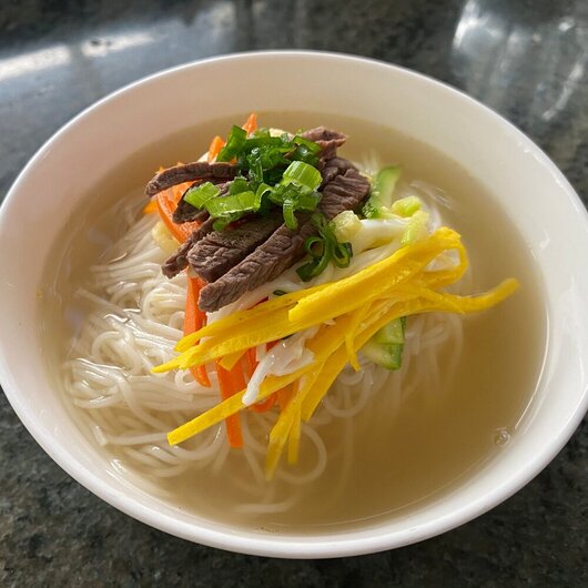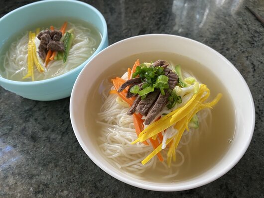 9. 완성된 육수를 소면 그릇에 부어줍니다.