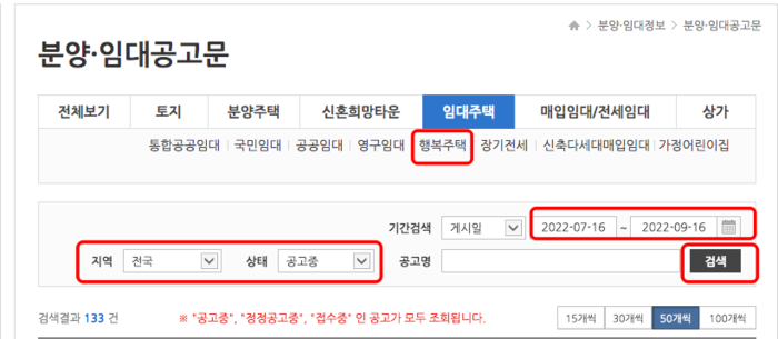분양 임대 공고문 메뉴가 나오면 하위에서 행복주택을 선택합니다. 이어서 거주를 원하는 지역과 상태 기간을 설정한 후 검색 버튼을 선택합니다.