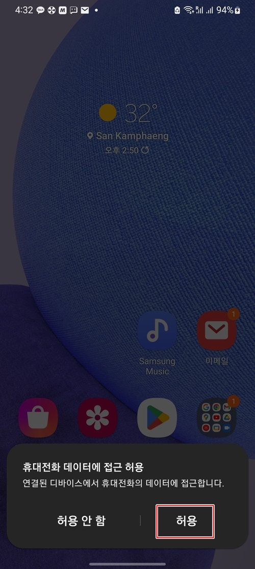 위의 사진과 같이 휴대전화 데이터에 접근 허용 메시지가 표시되면 허용을 터치합니다.