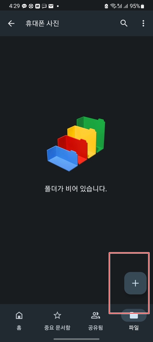 하단 메뉴에서 파일을 선택하고 휴대폰 사진을 업로드할 폴더를 생성합니다.